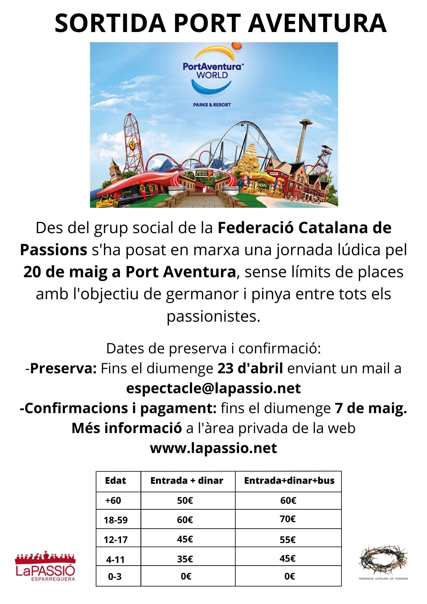 Un cop acabada la temporada pensem que anirà be poder gaudir d’un dia d’esbarjo i diversió. Des del grup social de la Federació hem posat en marxa una jornada lúdica per al dissabte 20 de maig i us proposem que sigui a Port Aventura, en una jornada oberta objectiu de germanor i de pinya entre tots els passionistes.